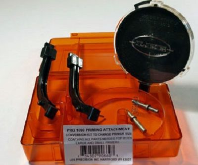 Lee Primer Attachment used for conversion to a different primer size for the Pro 1000 Press. Includes large and small troughs, primer pins, spring and a primer tray with cover.