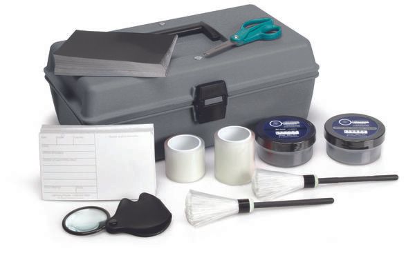 This kit contains everything you need for latent print dusting — two colors of fingerprint powder (Silver/Gray and Black), two colors of backing cards and two Zephyr® brushes. The Zephyr brushes are stored in protective tubes and held by clips inside the lid. The lift tape and powders are held in a fitted insert. A pair of scissors and a magnifying glass are also included. 1 – Kit Box C contains: Silver/Gray Powder, 44g (2oz.); Black Powder, 34g (2oz.); Two Zephyr Brushes; Clear Lifting Tape; 3.8cm x 9.1m (1 1/2" x 360"); Clear Lifting Tape, 5.1cm x 9.1m (2" x 360"); White Backing Cards, Pack of 100; Black Backing Cards, Pack of 50; Magnifying Glass; Scissors.