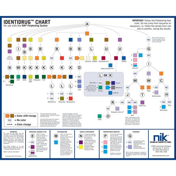 The Identidrug Desk Chart guides a user through the various steps required when testing a suspected narcotic with the NIK® Polytesting System. It begins with a general screening and uses blocks of color to indicate color changes in the test kits. The chart guides the user to the next test until a specific drug is identified. The back of the chart has general use instructions for the Polytesting System. Available in English or Spanish, the chart measures 8.5”W x 7”L (21.6cm x 17.8cm).