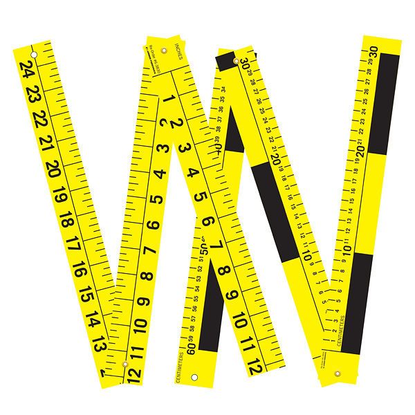 Designed for versatility, 3-Part Folding Scales feature L-shaped configurations on one face, measuring 12” (30cm) in the X plane and 24” (60cm) along the Y plane. The opposite face features a 36” (90cm) vertical straight scale with alternating black and yellow bands for maximum contrast at a distance. The articulated scale folds neatly in 12” (34cm) segments. The scale may be hung by a hole at the top of the scale. Made of rigid plastic, it can be cleaned with soap and water or decontaminated with a 10 percent bleach solution. This is an ideal scale for photography of shoe and tire impressions.