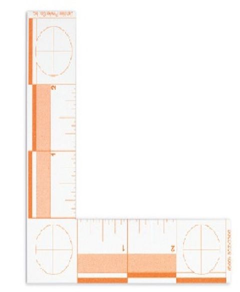 Designed for use with a Forensic Light Source or ultraviolet lamp, this fluorescent L-shaped scale is ideal for photographing evidence at such as latent prints developed with fluorescent dyes or powders, or for photography of fluorescing body fluid stains at crime scenes or on evidence. Inch markings are printed with fluorescent ink on a heavy, matte card stock. Alternating bars every inch help to identify measurements in grossly over- or underexposed photographs. The L-shape of the scale and the crosshairs at each end provide lines of reference for the measurements and ensure the scale is parallel with the film plane.