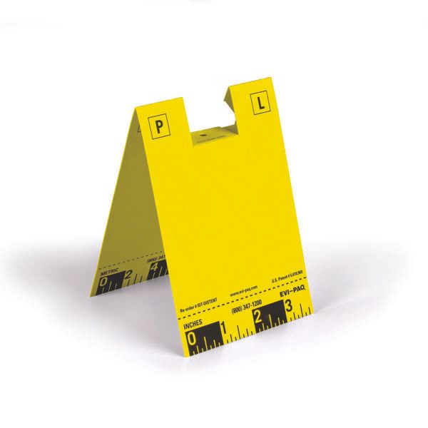 Developed by EVI-PAQ to be an inexpensive, disposable and flexible way to mark evidence. Perfect for use at bloody crime scenes. Simply discard the markers after use. No clean-up is necessary. Mark each ID Tent with any information pertaining to evidence. A large “P” and “L” have been printed on each side of the marker to indicate that the item has been photographed and logged prior to collection. Reference scales along the bottom edges in both metric and inches make evidence documentation simple. The sturdy cardboard construction and unique center brace ensure that each ID Tent remains standing and doesn’t sag. For additional stability, the brace has a perforated hole in the center where evidence marker flags can be placed, anchoring the Disposable ID Tent to the ground. A new updated design features easy-to-fold sections right above the scale so you can convert the scale to be flat against the surface. The scale at the bottom now goes to the edge for better measurements against evidence.