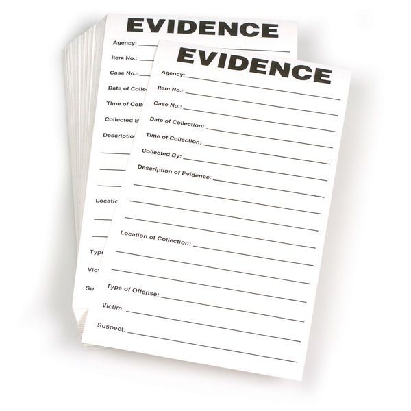 These adhesive evidence labels are printed with black ink on a matte white stock. Peel the backing from the label and permanently affix to almost any surface. Excellent for use with plain plastic bags, check sleeves, unprinted paper bags or boxes. Place these labels directly on evidence such as tires, bicycles or the undersides of stereos or televisions.