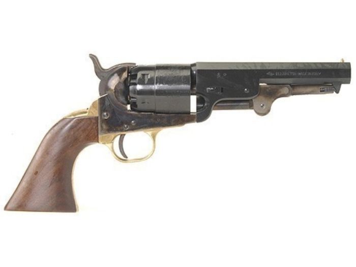 Produced from 1851-1872, the Navy is one of the most famous and widely-used cap and ball revolvers ever produced. This 1851 replica is perfectly balanced and features a tapered octagon barrel, 6-shot cylinder, fixed sights and a one-piece walnut grip. The 1861 Navy features a steel frame with a brass backstrap and trigger guard. Howell Conversion cylinder for this revolver sold separately.