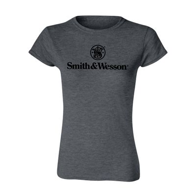 Full front print of the Smith & Wesson logo 50/50 Cotton Blend ladies tee shirt. Available in Charcoal. Imported.