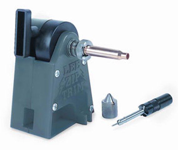 Lee Zip Trim rotates the case like a lathe. The case can be quickly trimmed, chamfered and polished. Used with the Case Length Gauge and Shell Holder, Cutter with Ball Grip, Deburring Tools, and 3-Jaw Chuck