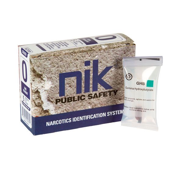 For the presumptive identification of GHB (Gamma-Hydroxybutyrate). It is used after positive results from Tests A, G, I, W, J and R. A positive result is indicated by a green hue. Available in a box of 5.