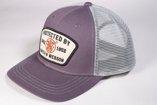 A Smith & Wesson® trucker cap with a Smith & Wesson® "Protected by Smith & Wesson" patch. Patch has tan background, embroidery details and 3D edging. Gray front and brim with heavy mesh that provides ventilation and durable long-lasting wear. Custom orange S&W Meatball logo design buckram liner. Heavy weight brim stiffener and semi curved brim.