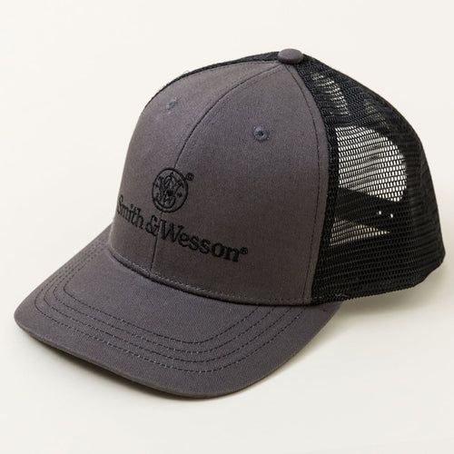 Smith & Wesson® two-tone grey and black trucker. 6-panel mid-profile construction and semi-curved brim with heavyweight stiffener maintain fit and shape. Lightly washed heavy mesh back for lasting performance and wear. Embroidered logo on the front. Contrasting black material under brim and a custom heather grey buckram liner.