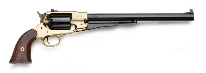 Over the years, this gun gained great favor with shooters, hunters and soldiers due to its rugged frame construction and excellent accuracy. Solid-brass frame (including strap over the cylinder) and trigger guard. Blued cylinder and octagonal barrel. Adjustable rear ramp sight.