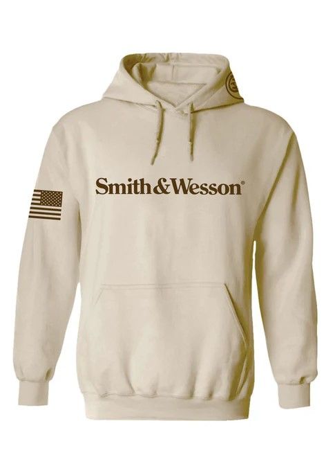 This desert sand Smith & Wesson® pullover hoodie features the Smith & Wesson® logo on the front along with a meatball-style logo on the hood and a US Flag on the right sleeve in brown.