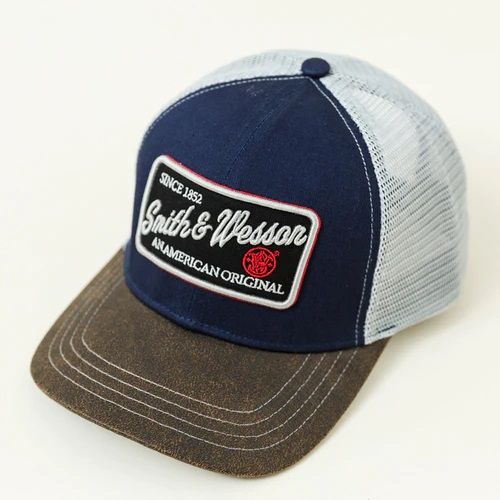 Smith & Wesson script logo embroidered inside of a rectangular twill patch celebrating the heritage of this American company. Navy front meets with the durable and long-lasting oilcloth brim. White heavy mesh provides ventilation and durable long-lasting wear. Custom Smith&Wesson® printed buckram liner add elegance and additional styling.