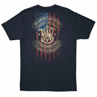Smith & Wesson® American Original design screen printed on the back of this premium short sleeve tee shirt in navy. Circular logo design incorporating the American Flag Stars & Stripes. Featuring double-needle stitched neckline, bottom hem and sleeves, seamless collar and shoulder-to-shoulder taping, this tee fits great and looks great. Smith & Wesson® has been Empowering Americans since 1852.