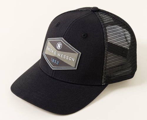 A heathered black linen Smith & Wesson trucker cap with a Smith & Wesson stacked logo patch. Two-tone patch includes 3D rubber logo details welded to a woven background. The black front and brim meets with black heavy mesh that provides ventilation and durable long-lasting wear. Custom blue & black hexagon printed buckram liner adds comfort and additional styling.