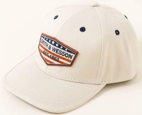 A light khaki Smith & Wesson full twill 6-panel cap with an American Flag Smith & Wesson embroidery detailed logo patch. Unstructured front with a mid-profile crown provides all day comfort and full coverage from the sun. Custom stars and stripes printed buckram liner provides comfort and added style. Contrasting navy underbrim helps protect from sun glare.