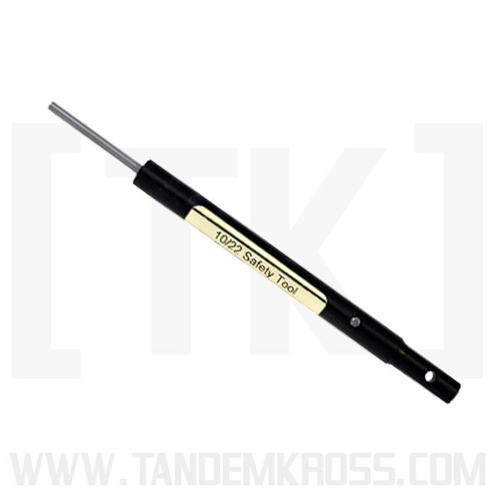 This tool is a dual purpose tool that allows you to easily remove the pins in the Ruger® 10/22® trigger assembly and easily take out the safety without losing the plunger and spring. One end of the tool acts as a pusher for the pin and the other end for the safety. The pin pusher end is removable and is used to capture the safety plunger. This part was designed by a professional gunsmith and with the versatility of this tool for working on the trigger assembly it is a must have for anyone working on a Ruger® 10/22®!